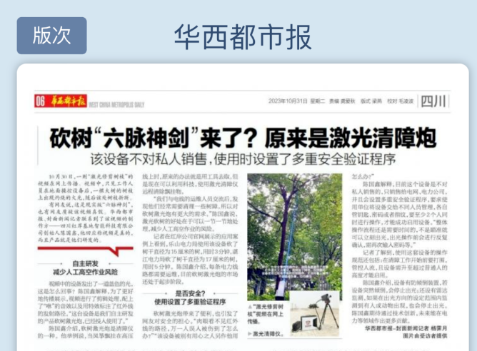 10月31日,华西都市报以头条大版面的形式,对我司四川红岸基地智能科技有限公司及所研发的激光远程清障设备进行了深度报道,展现了我们的核心竞争力和行业地位,突显了我们在激光远程清障,尤其是激光远程砍树领域的专业能力。作为最具公信力和学术关注度的官方媒体之一,华西都市报的这份报道不仅是对我们过去努力的肯定,更是对未来发展的期许。我们深感荣幸,并感谢华西都市报的支持与认可。这份宝贵的认可也将激励我们继续努力,持续创新,争取为社会贡献更多价值。
