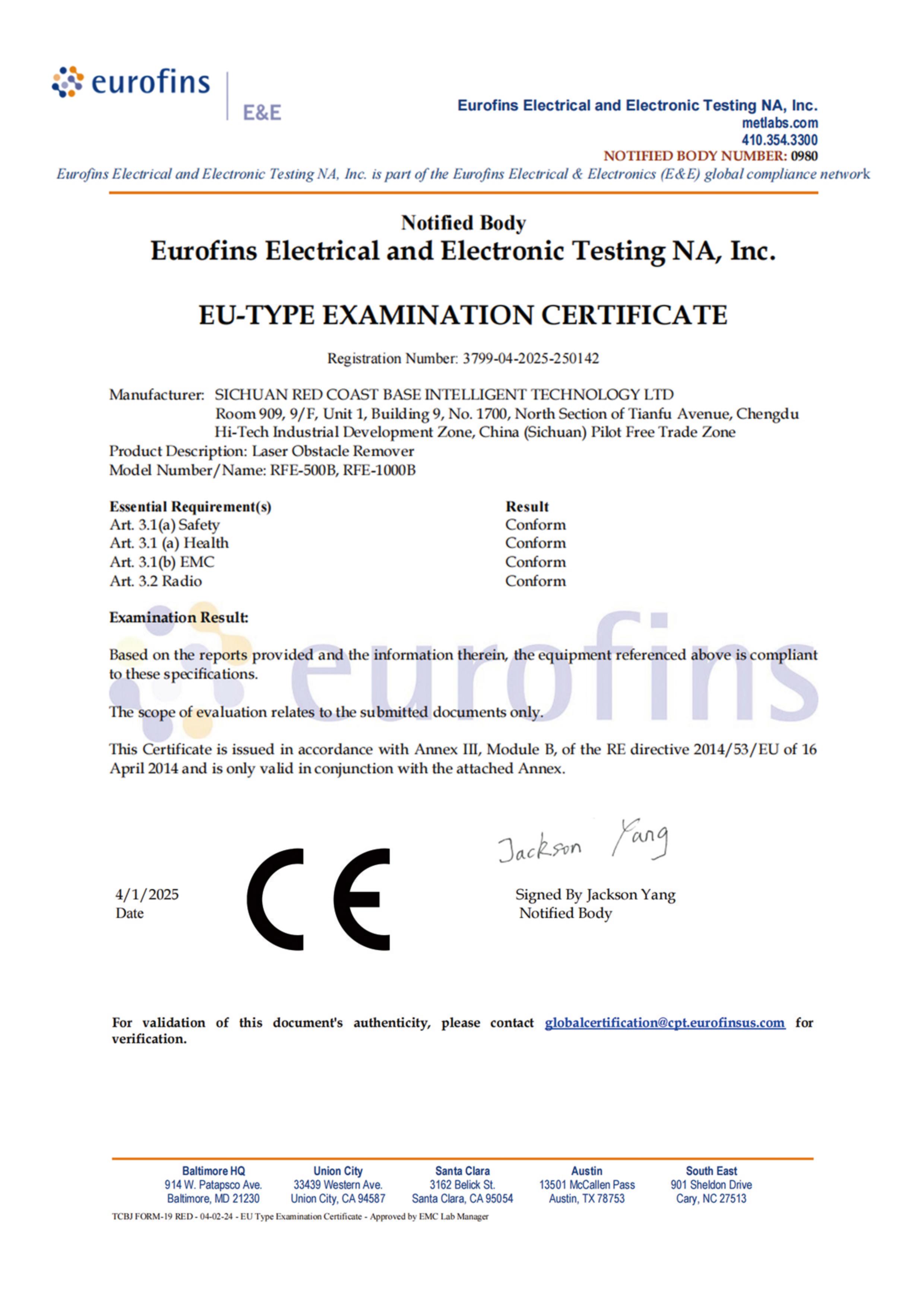 RedCoast Laser ha obtenido la certificación CE RED